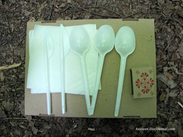 Столовые приборы по инструкции должны быть представлены одним ножом и 3 ложками, но в комплект просочился еще ножик. Также имеется 3 бумажных салфетки