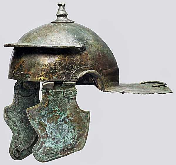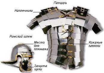 Голову легионера прикрывал бронзовый или железный шлем с козырьком, наушами и назатыльником, тело — кольчуга весом в 12 — 14 килограммов, которую в III веке до н.э. римляне заимствовали у кельтов.