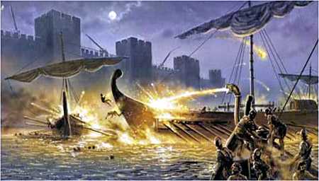 Сифон — это ручное оружие, труба, наполненная маслом. До сих пор, как и в случае с ручным огнемётом для “греческого огня” не понятен физический принцип действия оружия и не известен химсостав горючих смесей.
