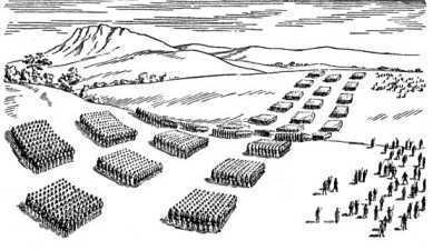 Боевым строем была уже знакомая нам фаланга: ряды копьеносцев (с лучше всего экипированными солдатами в первых рядах) с конницей и частями легковооруженных воинов на флангах. Тактика тоже лишь немногим отличалась, если отличалась вообще, от обычной тактики, выработанной древними греками. Армия во времена Сервия Туллия (ок. 580 до н. э.), по сведениям хроник состоявшая общим числом из 19 300 человек, насчитывала 18 центурий конницы; 80 центурий первого класса, в полном вооружении, из которых 4000 человек числились на активной службе; 10 центурий второго класса, как солдат активной службы, так и резервистов, предположительно имевших деревянные щиты; 10 центурий второго класса, сражавшихся без поножей; 10 центурий четвертого класса – не имевших кирасы или шлема и вооруженных только деревянным щитом, мечом и копьем; 10 центурий, состоявших из самых бедных граждан, вооруженных только дротиками или пращами. Имелось также 15 центурий саперов, музыкантов и т. п. Цифры эти, разумеется, не могут считаться точными, но все же дают представление о военной организации того периода, предшествовавшего созданию республики.