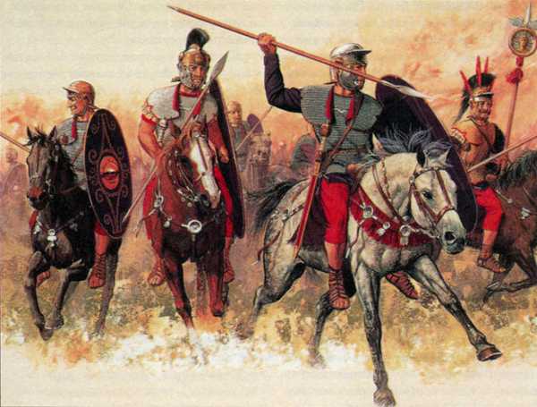 При столкновении с варварами (III — IV века н.э.), знавшими только рассыпной строй, римляне часто терпели поражение и вынуждены были создавать вспомогательные части из конницы и легковооруженной пехоты.