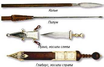 Оружием ближнего боя служил короткий меч с железным клинком — гладиус. Он висел с правой стороны, чтобы его можно было вынуть правой рукой, не выпуская из левой щита. На левом боку висело дополнительное оружие — короткий кинжал.