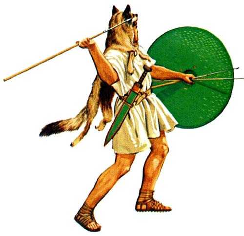 “Самым юным из солдат, трибуны предписывают вооружаться мечом, дротиками и легким щитом. Щит сколочен крепко и для обороны достаточно велик. По виду он круглый и имеет три фута в поперечнике. Легковооруженные, кроме того, носят на голове гладкую шапку, иногда волчью шкуру или что-нибудь в этом роде как для покрытия головы, так и для того, чтобы дать отдельным начальникам возможность отличать по этому знаку храбрых в сражении от нерадивых. Древко дротика имеет обыкновенно в длину два локтя и в толщину один дюйм. Наконечник его длиною в пядень и так тонок и заострен, что непременно гнется после первого же удара, и потому противник не может метать его обратно; иначе дротиком пользовались бы обе стороны.