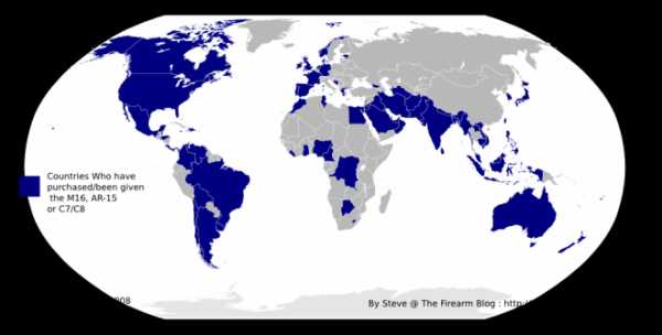 На карте 2008 года, синим показаны страны, принявшие AR-15 либо как основной вид оружия, либо как оружие спецназа и спецподразделений.