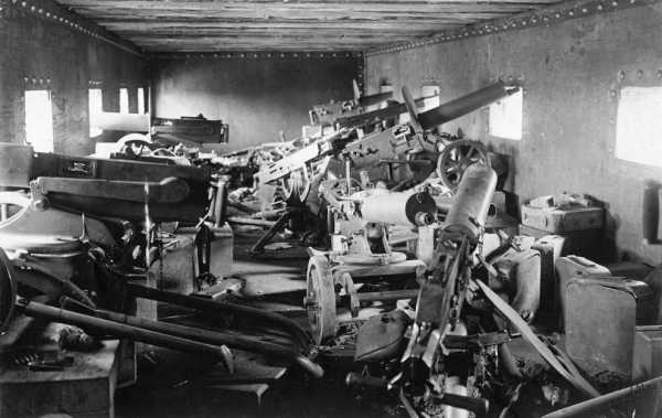 Внутри бронепоезда, Чаплино, Днепропетровская область, Украина, весной 1918 года. Сюда помещалось по крайней мере 9 тяжелых пулеметов с боеприпасами. (Фото Southern Methodist University | Central University Libraries | DeGolyer Library):