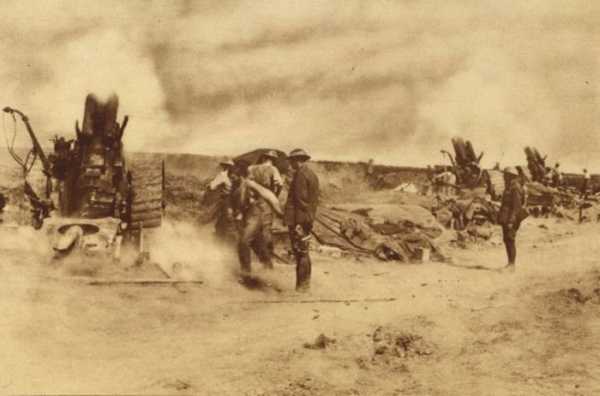 Британские гаубицы при стрельбе.