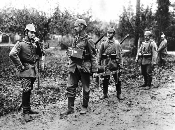 Слева — радиостанция, справа — генератор электричества для нее, нужно было крутить педали, как на велосипеде. 1917 год. (Фото National Archive | Official German Photograph of WWI):
