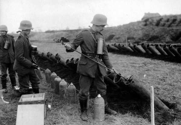 Химическое оружие. Немецкие солдаты готовят к запуску снаряды с газом. (Фото National Archive | Official German Photograph of WWI):