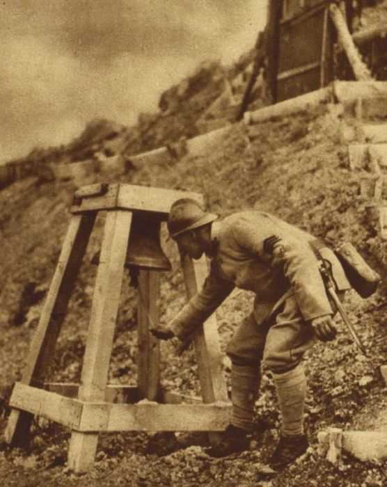 Французский солдат звонит в колокол, предупреждая, о газовой атаке.