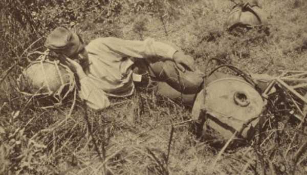Сербский солдат отдыхает возле бомбы, которую он взял из сбитого австрийского дирижабля.