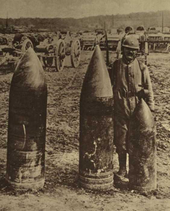 Французские солдаты, перевозящие 240-миллиметровые снаряды на фронте у Сомма.