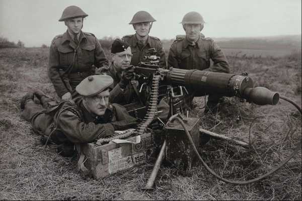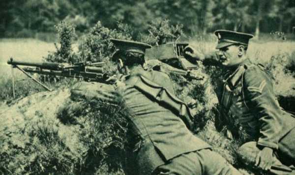 Британский солдат, во время стрельбы из пулемета Льюиса.