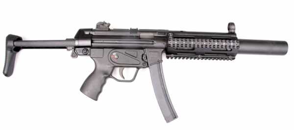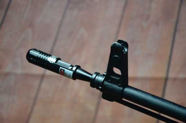 - Оружие имеет длинный цилиндрический пламегаситель.
