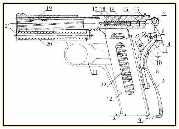 Пистолет ТКБ-205 в разрезе. 1 — рама; 2 — пластиковая рукоять: 3 — курок; 4 — ось курка; 5 — рычаг курка; 6 — ось; 7 — ось шептала; 8 — боевая пружина; 9 — пружина зашслки; 10 — шептало; 11 — спуск; 12 — магазинная коробка; 13 — дно магазинной коробки; 14 — подаватель; 15 — затвор; 16 — стопорная шпилька ударника; 17 — боек; 18 — пружина: 19 — ствол; 20 — возвратная пружина; 27 — стержень возвратной пружины: 22 — пружина магазина.