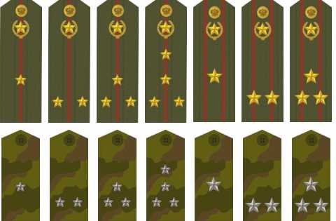 Далее приведем средний и старший начальствующие составы. Все также, как и на картинке выше — звания расположены слева-направо, верхний ряд это погоны, которые носят повседневно, а нижний только в полевых условиях: