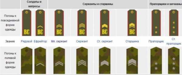 - Старший сержант . Солдат, удостоенный данного звания, получает вместо трех узких полосок на погонах российской армии одну широкую. Звание старший сержант занимает промежуточную ступень между старшиной и сержантом.