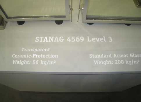 Прозрачная броня фирмы IBD на выставке «Евросатори-2012». Видно, что прозрачная керамика почти в 4 раза легче стандартного броневого стекла.