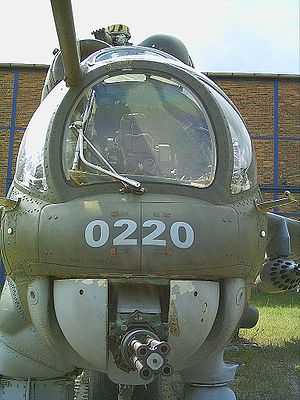 Лобовое бронестекло кабины вертолёта Ми-24. Внизу 4-ствольный пулемёт ЯкБ-12,7.