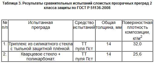 ОАО «НИИ стали» проводятся интенсивные работы по изучению материалов и разработке структур для прозрачной брони, имеющие целью снижение массы преграды. Так, например, хороший результат в данном направлении достигается при применении в прозрачных бронеструктурах кварцевого стекла (таблица 3).