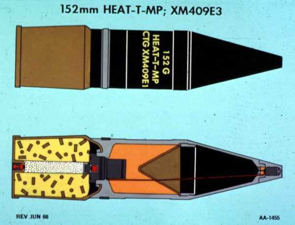Из-за новой системы продувки уменьшился и штатный боекомплект — с 30 до 29 снарядов. Первоначальная номенклатура боеприпасов предусматривала и дымовой, и осколочно-фугасный, но очередные проблемы с конструкцией оставили танк только с кумулятивным противотанковым трассирующим (M409 HEAT-T-MP) ну и ракетой «Шиллейла», естественно. Чуть позже, уже во Вьетнаме добавили такую «экзотику» как шрапнельный боеприпас M625, что в принципе для 152мм короткоствольного орудия — вполне разумно.
