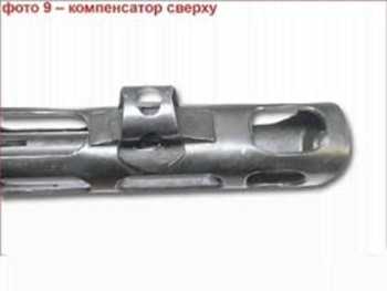 Фото 27. Чтобы автомат не трясло при автоматической стрельбе и для улучшения кучности боя, пистолет-пулемет Шпагина оснащен так называемым дульным компенсатором активного действия (Фото 8-9). При этом удар газовой струи после выхода пули принимается на скошенную поверхность, находящуюся перед дульным срезом. Этот удар дает импульс силы, направленный против действия отдачи, чем достигается уменьшение энергии отдачи всей системы. Отверстия для выхода газов сделаны вверх и в стороны, чтобы пороховые газы не поднимали пыль, которая мешает прицеливанию и демаскирует стрелка. При таком устройстве газы выбрасываются в стороны и в основном вверх, вследствие чего компенсатор получает движение вниз и компенсирует опрокидывающий момент, возникающий под действием отдачи.