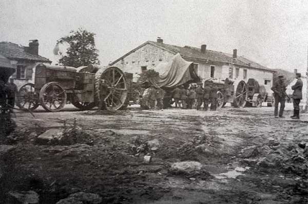 Расчёт «Большой Берты» на марше. Тягачи концерна Daimler везут разобранное орудие