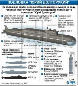 - проекта 955 «Борей»: «Юрий Долгорукий», «Александр Невский» (заложен в 2004 году) и «Владимир Мономах» (заложен в 2006 году). Всего до 2015 года подразумевается выстроить 5 субмарин проекта 955. Любая АПЛ будет нести 16 твердотопливных ракет типа «Булава» с разделяющейся головной частью.