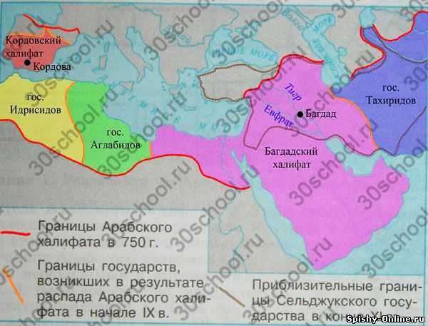 Огромная исламская держава (сперва ее столицей был Дамаск, затем Багдад) недолго сохраняла единство. В 750 г. в отдельный халифат выделилась Испания. В начале IX века возникли самостоятельные халифаты в Марокко, Египте, Иране, Средней Азии.