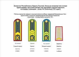 На погонах сержантов (старшин), солдат (матросов), проходящих воинскую службу по контракту и по призыву (кроме курсантов средних и высших военно-учебных заведений, воспитанников Кадетского корпуса и Республиканской школы «Жас улан»), нашивки соответственно воинскому званию (рисунки 188, 189, 190) располагаются у: