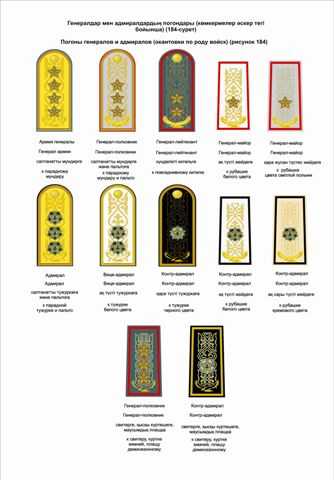 1) Верховного Главнокомандующего Вооруженными Силами Республики Казахстан – вышитый позолоченной мишурой и шелком парящий орел золотистого цвета. Расстояние от нижнего края погона до нижнего края орла 8 мм;