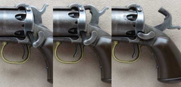 Для размещения этого рычага в передней части рамки был добавлен массивный выступ, в котором на оси закреплен рычаг снаряжения (rammer type loading lever). Между барабаном и рамкой был предусмотрен паз для удобства установки пули между поршнем рычага снаряжения и каморой барабана.