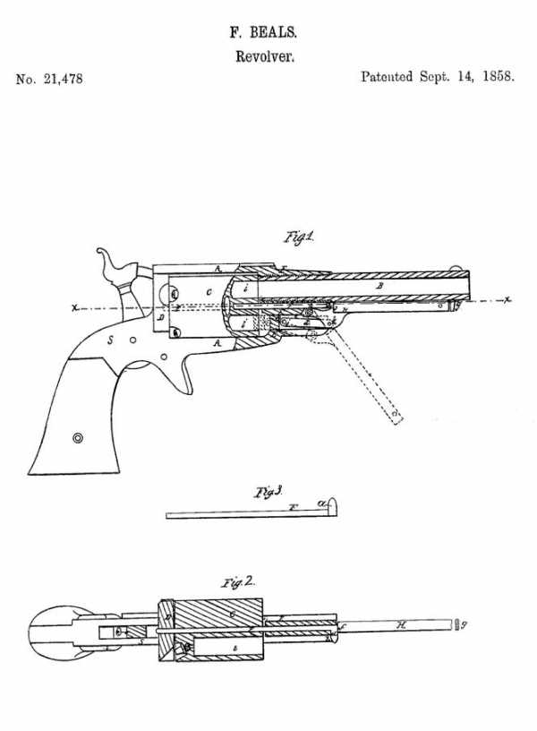На верхней грани ствола револьвера Remington-Beals 3rd Model Pocket Revolver нанесена маркировка, в которой появилось упоминание на патент 1858 года: «BEALS PAT. 1856, 57, 58 / MANUFACTURED BY REMINGTONS’, ILION, N.Y.».