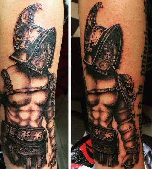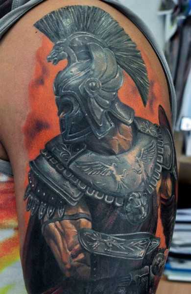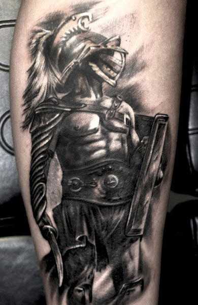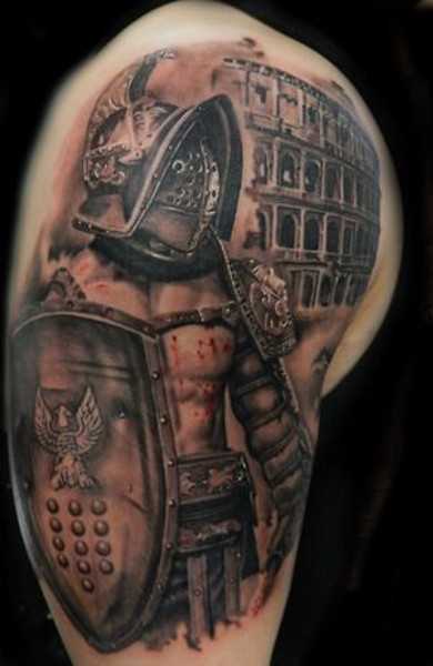 Подобная татуировка отдает дань истории и переносит в эпоху доблестных сражений, отваги и героизма. Чаще всего на татуировках изображают знаменитых гладиаторов Рима и провинций Римской империи, героев Греции и поэмы Гомера «Илиада».