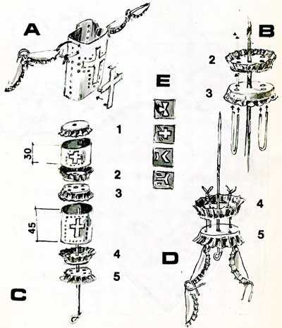 В начале заготавливаются детали: четыре пробки с помощью плоскогубцев легкими ударами молотка по краям расправляются так, чтобы они получили форму плоских дисков, напоминающих перевернутую вверх дном тарелку. Эти диски будут использованы для сборки основания фигуры. Три пробки превращаются в выпуклые сферические диски. Для этого надо пробки расправлять молотком на металлической подставке, поворачивая их и равномерно ударяя по гофрированному краю. Из сферических дисков делают щит рыцаря и спинку. Пять пробок в своей обычной форме используют для сборки пояса — 2 шт. и плеч — 3 шт. Остальные 17 пробок плоскогубцами сгибают пополам в виде речной ракушки. При этой операции постарайтесь поверхность пробок не мять и не царапать.