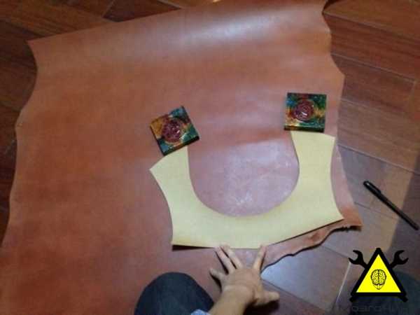 7. Можно к лицевой части сделать дополнительную декоративную накладку, которая так же будет играть дополнительную защиту. Для этого соединить лицевую часть с боковыми стенками с помощью болтиков. Взять листок бумаги приложить к лицевой части и прорисовать шаблоны. Ширина накладок составляет 1,5 см (рис.6). Приклепать эти накладки.