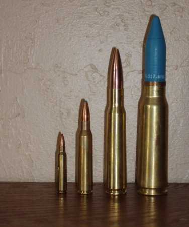 По сравнению с пятидесятым калибром патрон калибра двадцать миллиметров выглядит внушительно. А вот если его сравнить с себе подобными, то становится ясно что он (второй справа) имеет не самый большой объём гильзы.