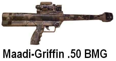 Данную модель трудно отнести к обычным однозарядным пистолетам хотя бы потому, что внешне он скорее напоминает ручную пушку. Обладая способностью стрелять патронами винтовочного типа, он получает не только дополнительную пробивную способность, но и ряд преимуществ при стрельбе с дальней дистанции. Для того, чтобы преодолеть ужасающую отдачу, разработчиками был установлен дополнительный дульный тормоз, который выделяется из гармоничного силуэта Maadi-Griffin .50 BMG.