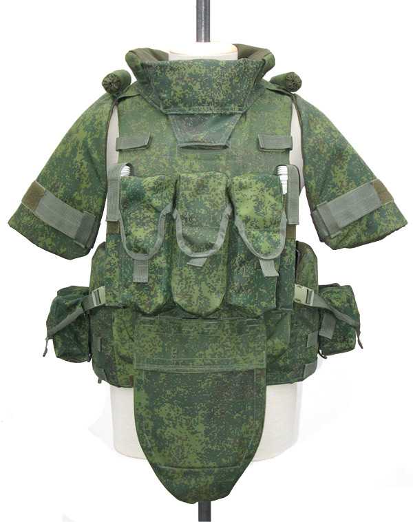 Принят на вооружение ВС РФ в 2010 г. Класс защиты А, Б. Защитит солдата и на дальней, и на ближней дистанции, от обычных пуль и от бронебойных. Может применяться во всех климатических зонах при температуре от -50 до +50оС включительно! При этом масса варьируется, как и у всех подобных изделий — от 4,5 до 15 кг. Так же, как и импортные образцы, оснащён системой быстрого сброса. В общем, на уровне, если не выше! Почему же 6-е место? По практическим оценкам специалистов, есть одна существенная недоработка: разная регулировка для стоячего и сидячего положений, что не только неудобно, но и попросту непрактично — приходится бронежилет постоянно «подтягивать» или, наоборот, «отпускать». Это упущение, видимо, будет ещё исправляться.
