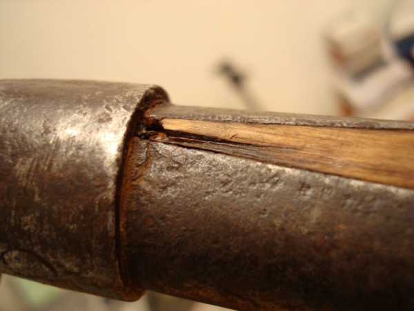 У клепаной лопаты обращаем внимание на черенок возле обжимного кольца. Возраст дает о себе знать, и в этом месте могут быть трещины и щепа. Обязательно, надо заклеить. Иначе, как именно пойдет щепка в момент удара лопатки о дерево, при сильном броске, трудно предусмотреть.