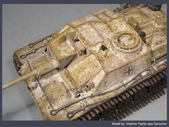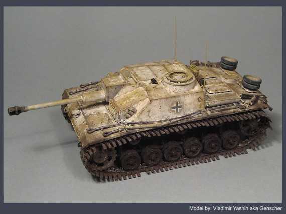Данный Штурмгешутц строился на заказ. Сборочными работами занимался Павел Черепанов, ну а я выполнял окраску и тонировку. Саму сборку можно охарактеризовать как изкоробочную, но с использованием нескольких наборов афтермаркета. Базовый кит от Драгона очень и очень неплох и приятно удивил по сравнению с аналогичным Штугом японской Тамии. Для добавления ажурности и аккуратности использовалось базовое травло и крылья фирмы Вояджер, мортирки, антенны и стволик Арморскэйл, металлические тросы Eureka. Особый колорит модели придавали широкие лапти зимних траков Винтеркеттен. В соответствии с фотографиями, фриуловские траки были заметно покоцаны и помяты. В ряде мест расширители были и вовсе отломаны, что часто видно на фронтовых фото.
