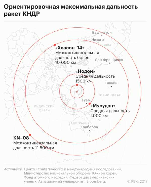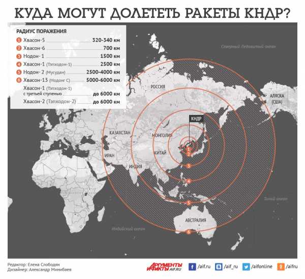 Отметим, что радиус поражения самой передовой из испытанных ракет КНДР — «Тэпходон-2», 6 тысяч километров — включает в себя из американских территорий только Аляску, а из российских, например — всю азиатскую территорию страны и часть Кольского полуострова.