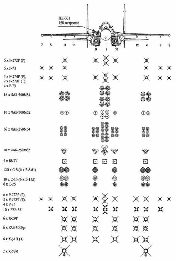 - Вооружение: воздух-земля — противокорабельные ракеты (две Х-59М, шесть Х-31 и ракета воздух-земля большой дальности), высокоточные боеприпасы (шесть КАБ-500, КАБ-1500, С-25ЛД, Х-25 и шесть Х-29), неуправляемые боеприпасы (бомбы различного калибра и назначения до 1,5 т, С-8, С-25 (НАР)). Воздух-воздух — ракеты малой дальности (четыре Р-73), средней дальности (шесть Р-27ЭР, Р-27П, Р-27Т; десять РВВ-АЕ), большой дальности (РВВ-БД).