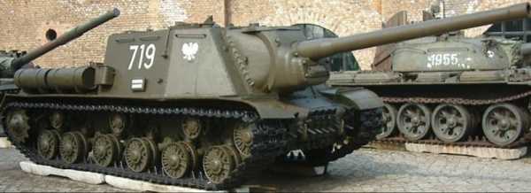 Установка создана на базе танка «ИС-1/2» и принята на вооружение в 1943 г. С начала 1945 г. на САУ устанавливался зенитный крунокалиберный пулемет. Самоходка использовалась как тяжелое штурмовое орудие, истребитель танков и как самоходная гаубица. Всего в период войны было выпущено 1 885 машин. ТТХ САУ: длина – 9 м; ширина – 3,1 м; высота – 2,9 м; клиренс – 470 мм; масса – 46 т; бронирование – 20 — 100 мм; тип двигателя — 4 тактный 12 цилиндровый дизель В-2-ИС; мощность двигателя – 520 л.с; удельная мощность – 11,3 л.с/т; скорость передвижения по шоссе – 40 км/ч; запас хода – 350 — 500 км; основное вооружение – 152,4-мм гаубица-пушка «МЛ-20С»; боезапас – 21 выстрел; бронепробиваемость на дистанции 1000 м -123 мм; дальность выстрела прямой наводкой – 3,8 км; максимальная — 13 км; высота линии огня – 1,8 м; дополнительное вооружение – 12,7-мм пулемет ДШК, боезапас – 250 патронов; экипаж – 5 человек.