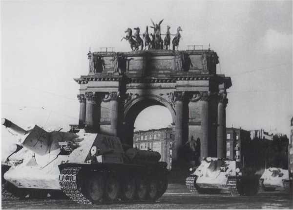 САУ СУ-122 направляются на передовую у Нарвских ворот в Ленинграде.