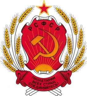 — РСФСР. Щит окаймляли пшеничные колосья, закрепленные красной лентой с