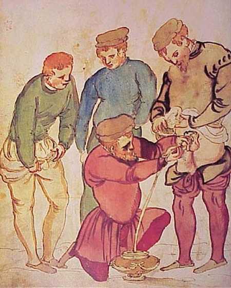 Застой мочи в мочевом пузыре из-за сифилиса и других венерических заболеваний без сомнений можно назвать одним из самых распространенных заболеваний того времени, когда антибиотиков просто не было. Катетер для мочи — это такая металлическая трубка, которую вставляли через мочеиспускательный канал в мочевой пузырь. Впервые ее начали использовать в середине 1300-х годов. Когда трубкой не получалось достичь цели для того, чтобы устранить преграду испусканию вод, приходилось придумывать другие процедуры, некоторые из них были весьма изобретательны, но, вероятнее всего, все были достаточно болезненные, впрочем как и сама ситуация.