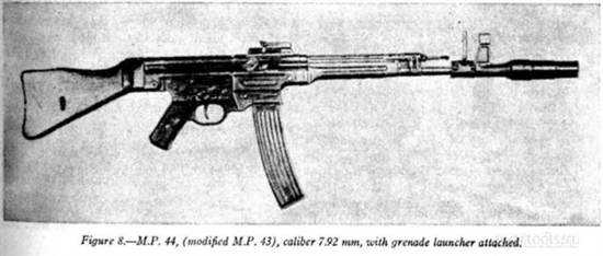 В июне 1944 г. появились два типа боеприпасов: один с зарядом массой 1,5 грамма под Gewehrsprenggranate (осколочные) и один с зарядом массой 1,9 грамма под Gewehrpanzergranate (бронебойно-кумулятивные). В январе 1945 г. решили проблему с автоматикой, в марте и апреле 1945 г. MP 44 с Gewehrgranatgerаt успешно прошёл испытания. Для стрельбы из гранатомёта, однако, требовался специальный прицел, проблему которого разрешить так и не удалось.