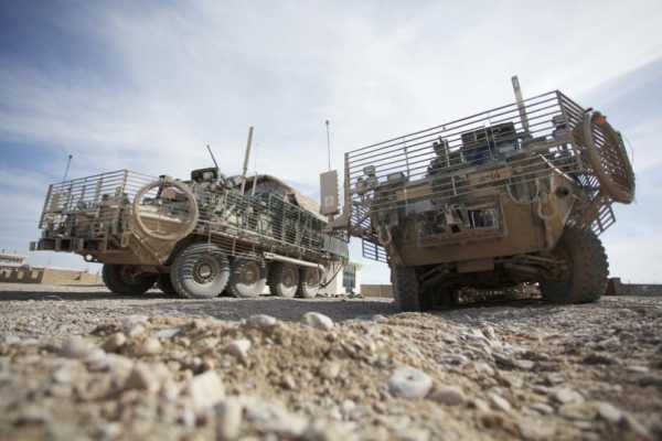 Американский БТР «Стракер» с решетчатой защитой от реактивных гранат, установленной на корпусе