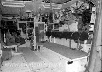 Десантное отделение Десантное отделение БТР «Страйкер» Девять вооруженных до зубов воинов с полным снаряжением попадают в бронетранспортер и покидают его посредством огромной снабженной собственным приводом двери-рампы в корме корпуса машины. В рампе сделана небольшая дверца, которая открывается наружу вправо. Таким образом, дабы попасть внутрь или покинуть броневик совсем не обязательно тревожить привод рампы. По бортам десантного отделения установлены лавки, солдаты сидят на них лицом к продольной оси машины. Четверо сидят на правой лавке, пятеро – на левой. Командир пехотного отделения занимает переднее место на левой лавке лицом вперед, параллельно командиру бронетранспортера. Над сиденьем командира десанта в крыше корпуса сделан четырехугольный люк. В крыше над десантным отделением есть еще два вентиляционных люка. Размеры люков позволяют солдату встать на лавку и просунуть голову с плечами в отверстие крыши, поражая противника огнем из личного оружия. Бить прикладом и колоть штыком, стоя на лавке, через открытый люк, однако, не очень удобно. В десантном отделении устроены крепления для разнообразных солдатских аксессуаров, от личного оружия до туалетной бумаги.