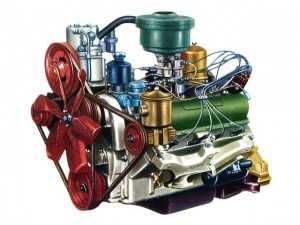 В составе этого механизма имеются два поршня, которые крутит коленвал. Ему же вращение передает шкив, который, в свою очередь, объединен с другим фрикционным колесом вала вентилятора.